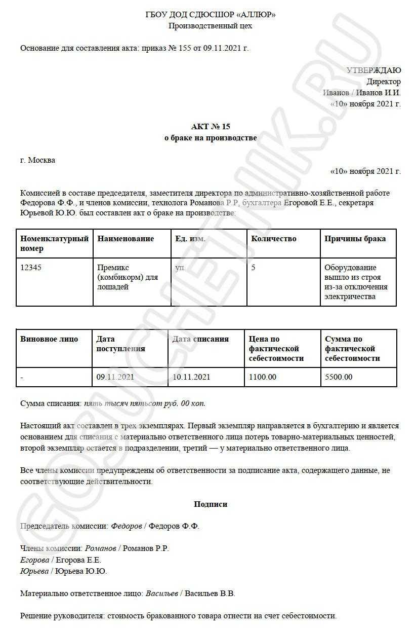 Акт оформляет комиссия. Подписывают документ все члены комиссии, материально ответственный сотрудник и виновное лицо, если его определили. Обычно акт составляют в трех экземплярах: один — для бухгалтерии, другой — для подразделения, в котором выявили дефекты, третий — для материально ответственного лица.