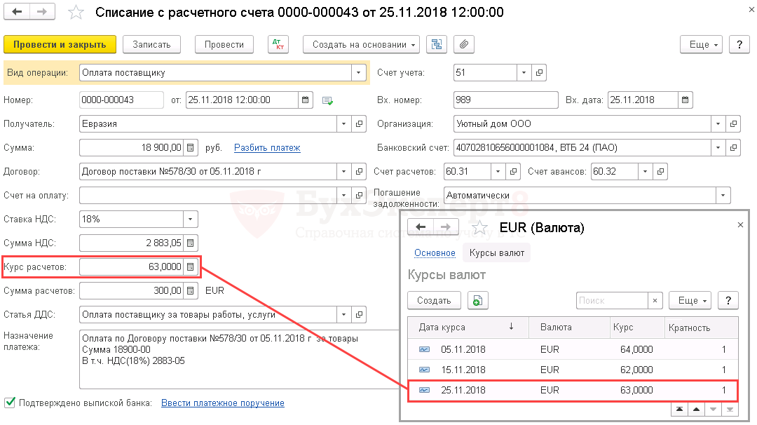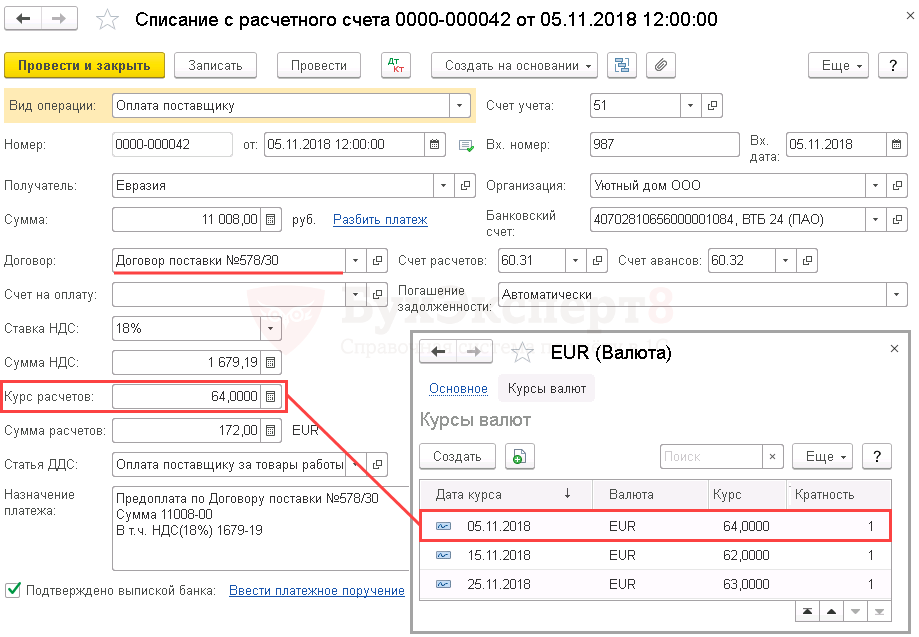- Курс расчетов – курс на дату оплаты из справочника Валюты;