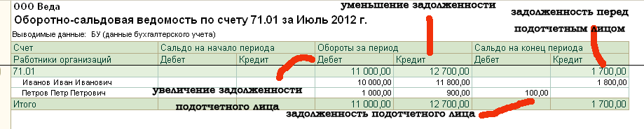 Какой вывод мы можем сделать из данного регистра? Обороты по дебету счета формы оборотная ведомость по счету 71 показывают денежные средства, которые были выданы подотчетным лицам и, соответственно, увеличение их задолженности перед предприятием. По кредиту счета мы видим те суммы, по которым подотчетные лица представили авансовые отчеты и уменьшили свою задолженность перед предприятием.
