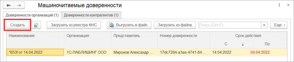 В программах 1С создать машиночитаемую доверенность организации можно следующим способом: