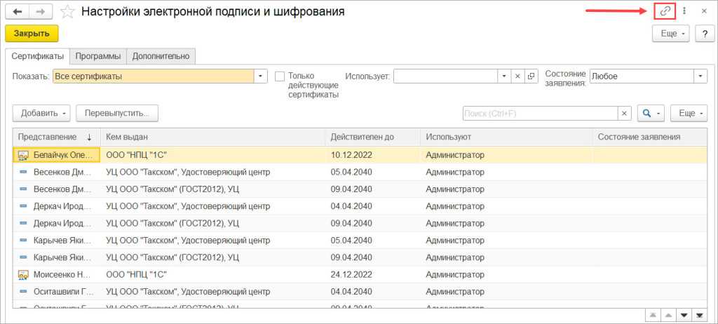 Для этого администратору или иному пользователю с подходящими правами необходимо зайти в справочник Сертификаты ключей электронной подписи и шифрования, нажать кнопку Получить ссылку и отправить ее пользователю, у которого нет прямого доступа к справочнику.