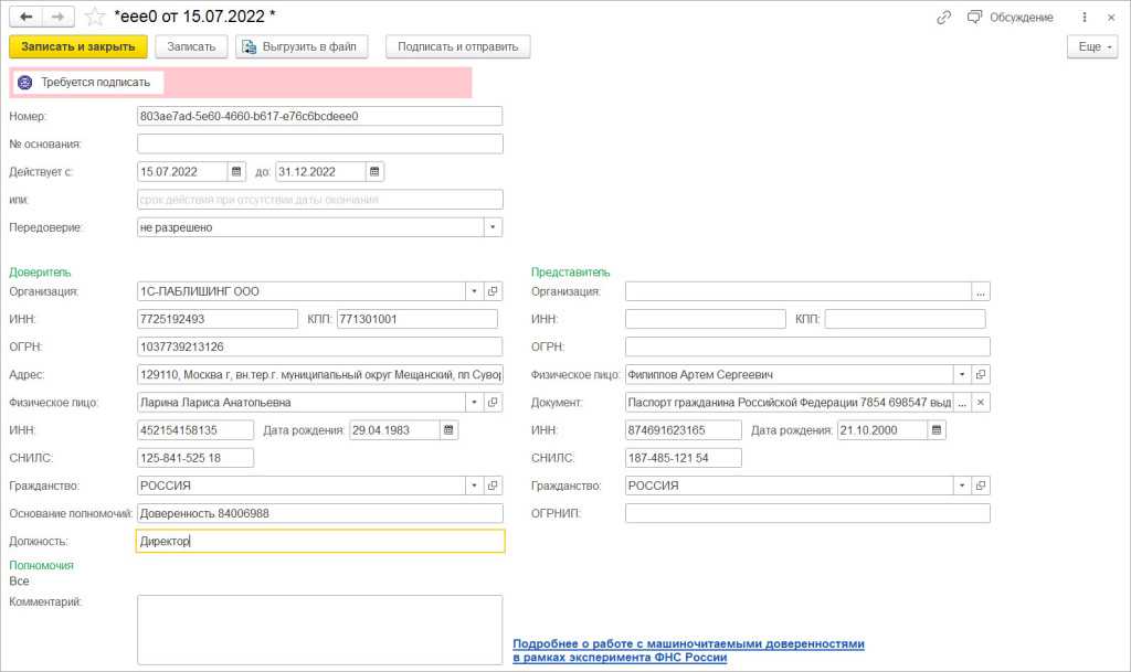 Откроется карточка регистрации машиночитаемой доверенности, в которой необходимо заполнить данные. Некоторые поля заполняются автоматически, например, при выборе организации заполняются поля с ее данными.