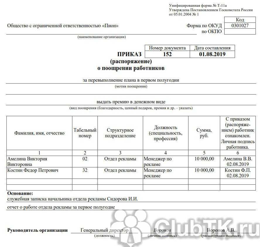Образец приказа о премировании сотрудников формаиТ-11 и Т-11а