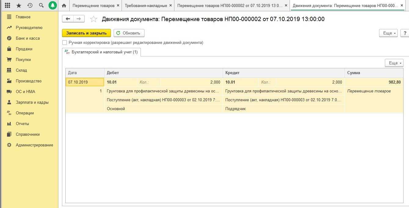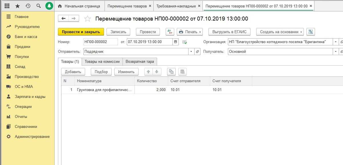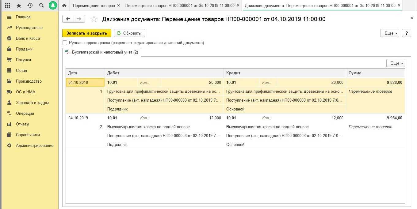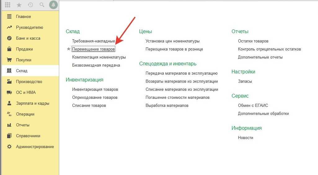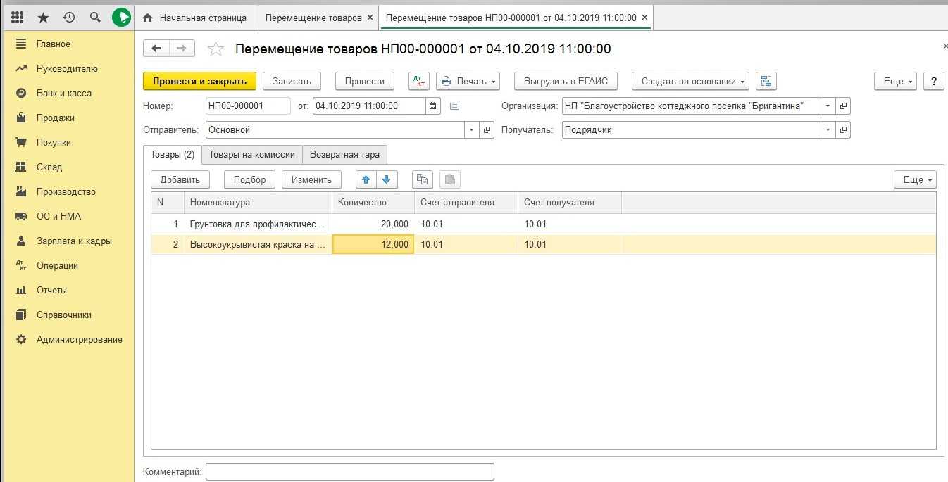 Сама передача материалов будет оформляться через специальный документ, который называется «Перемещение товаров».