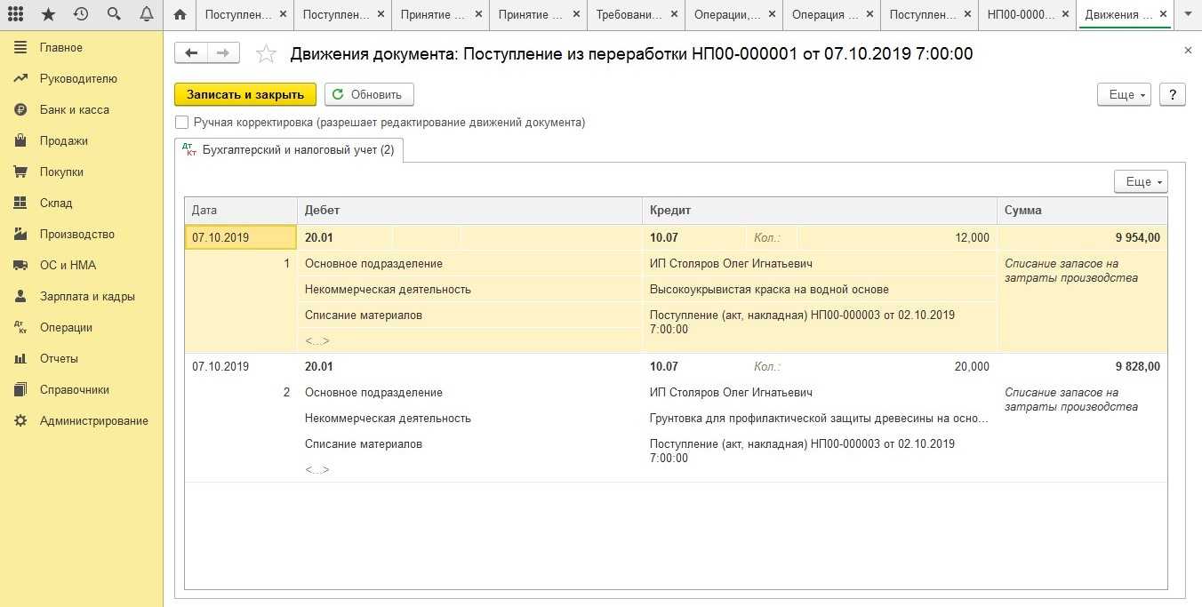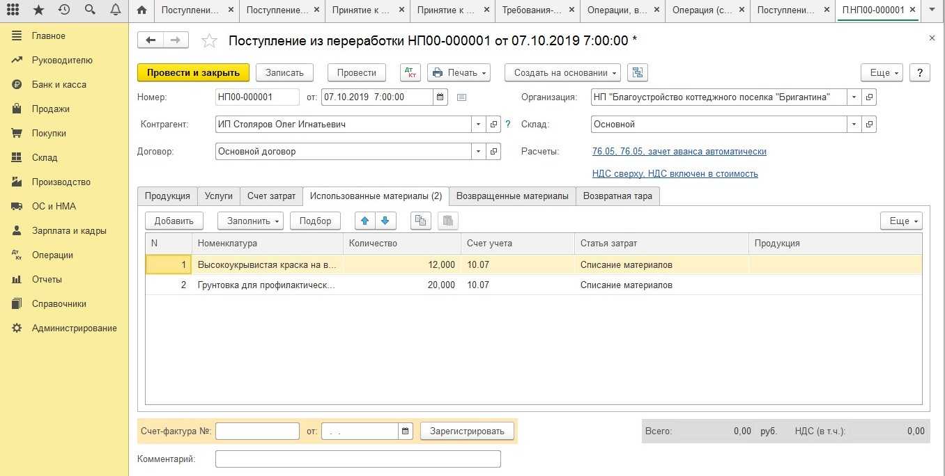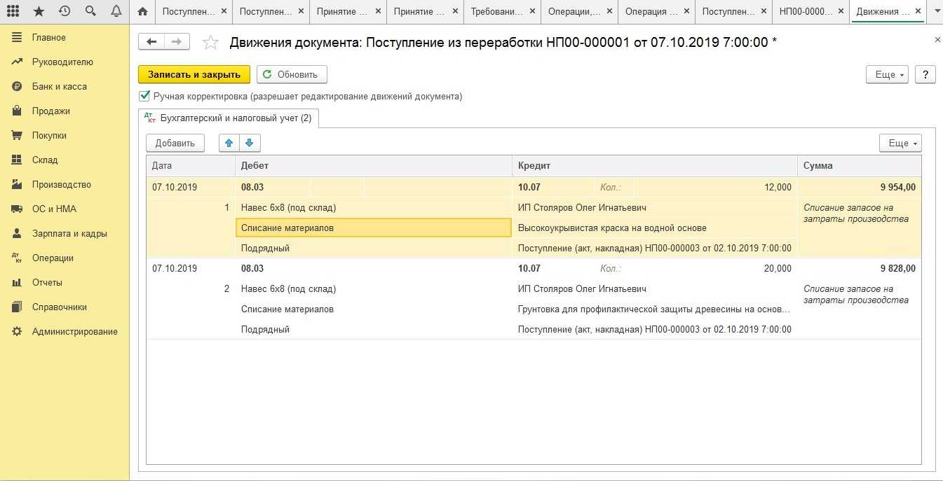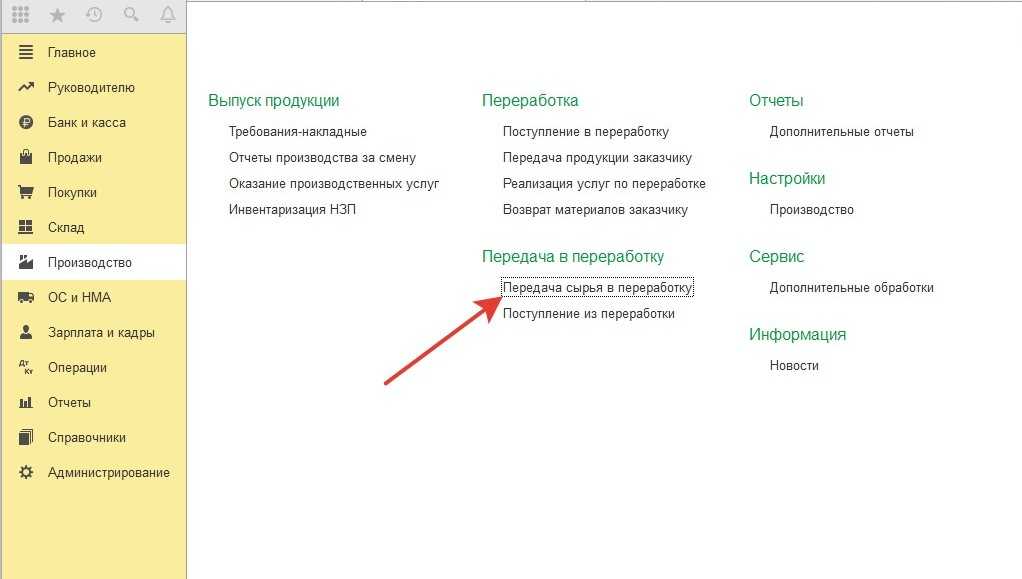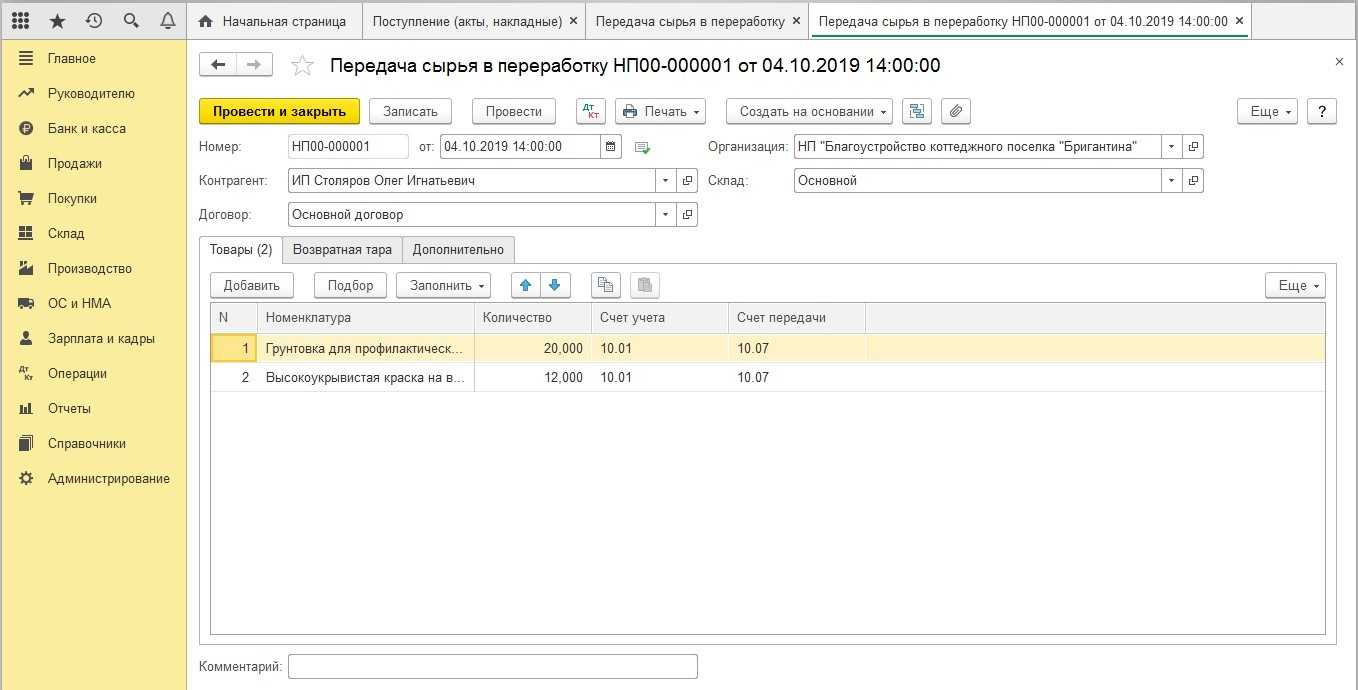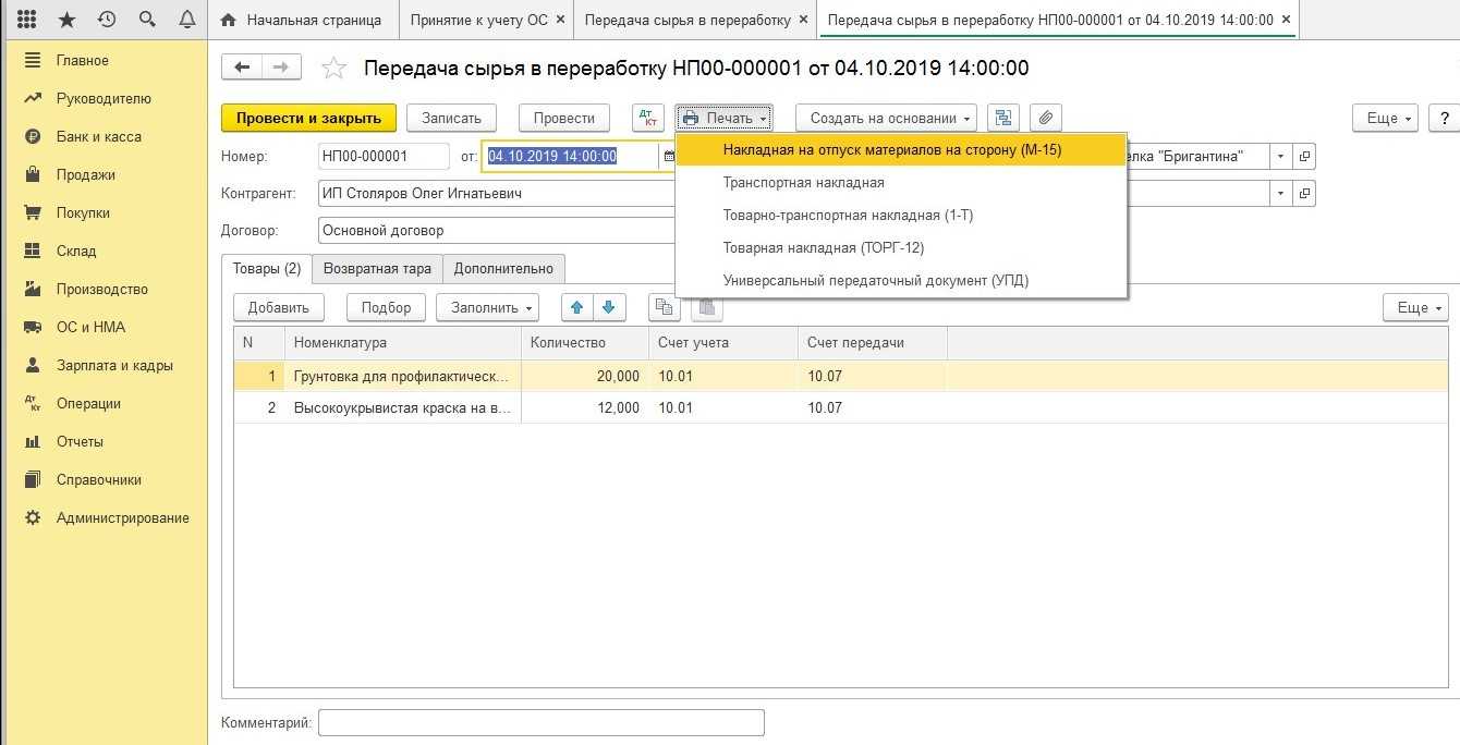 Далее вы передаете ценности торгово-материальные ценности подрядчику и оформляете документ «Передача сырья в обработку».