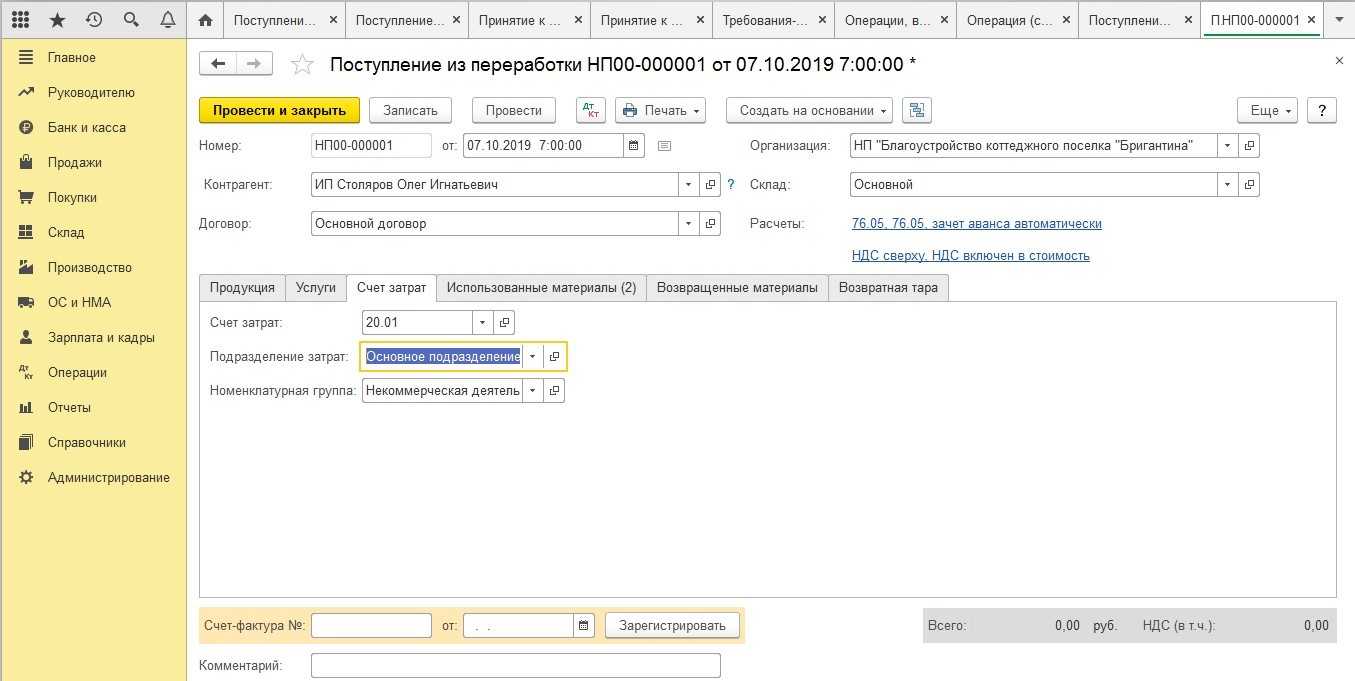 Заполняем вкладку «Счет затрат» и проводим документ: