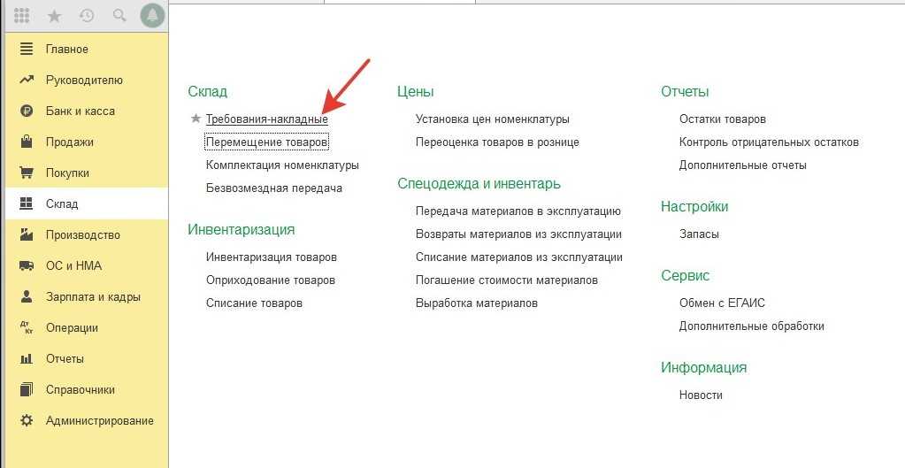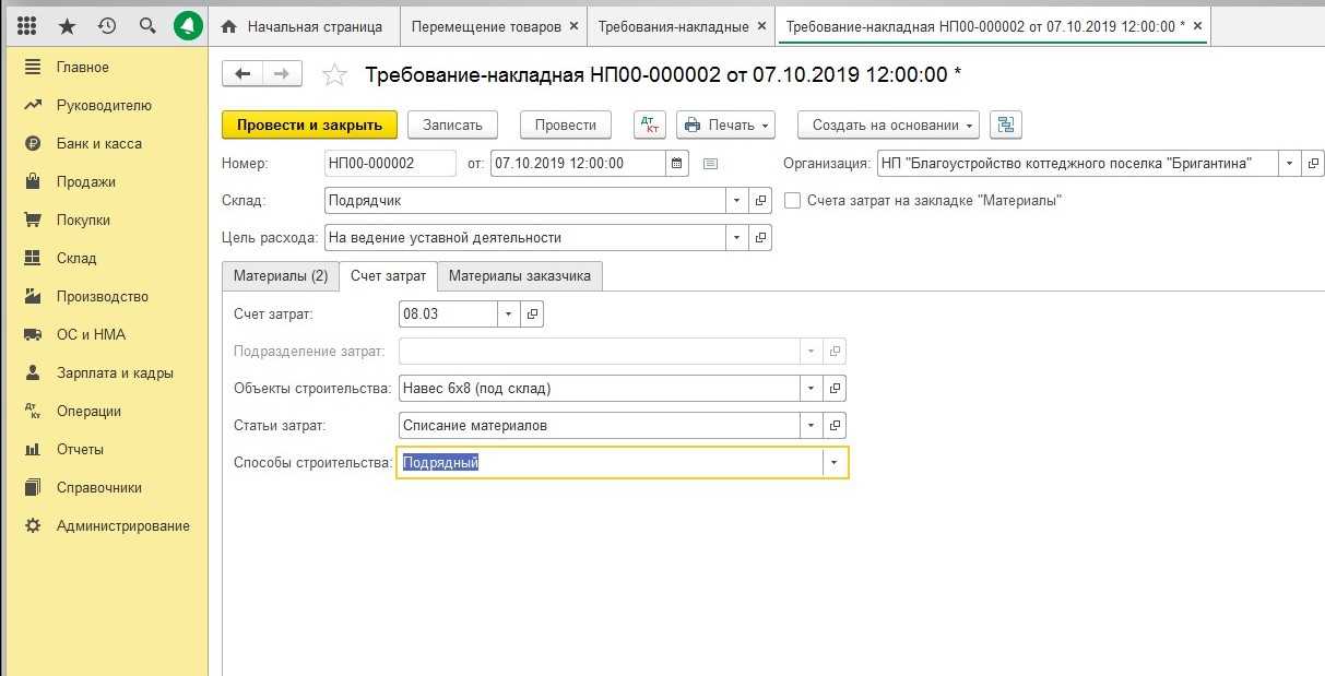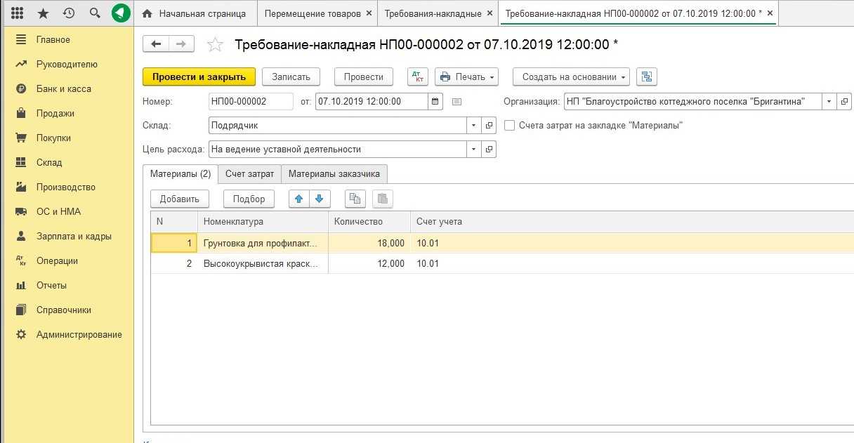 Чтобы списать на ремонт материалы, создаем документ «Требование-накладная»: