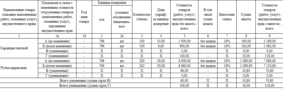 ООО «Компания» 26 марта отгрузило АО «Покупатель» товар. 25 мая было согласовано изменение цены на «Карандаш цветной» с 10 до 9 рублей. Также при пересчете поставленного товара обнаружено, что «Ручка шариковая» поставлена в количестве 202 шт., то есть на 2 больше, чем указано в отгрузочных документах. 28.05.2018 ООО «Компания» выставляет КСФ.