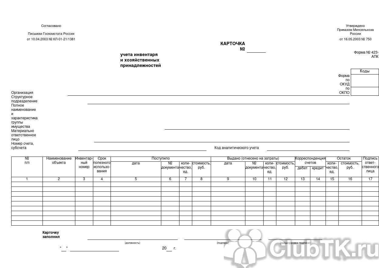 Подписывает лицевую сторону карточки ответственный исполнитель. Оборотную сторону заполняют при выбытии материального актива из эксплуатации. Списание проводят на основании заключения специальной комиссии.