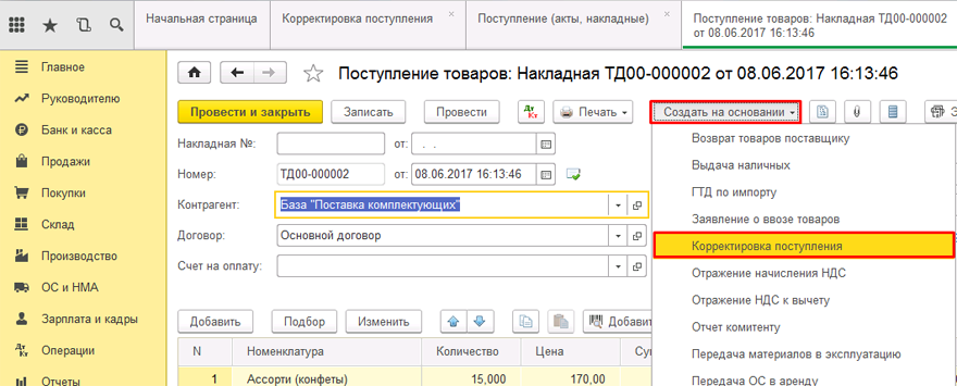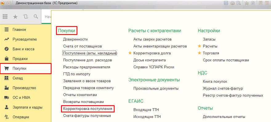 Для создания выбираем раздел Покупки – Корректировка поступления