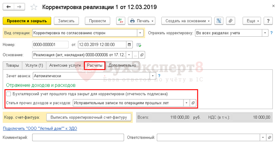 ● Если же отчетность уже сдана и период закрыт, а сумма документа уменьшается, то в документе на вкладке «Расчеты» необходимо установить флаг «Бухгалтерский учет прошлого года закрыт . » и указать статью прочих доходов/расходов:
