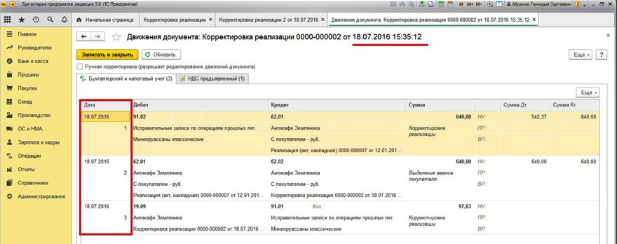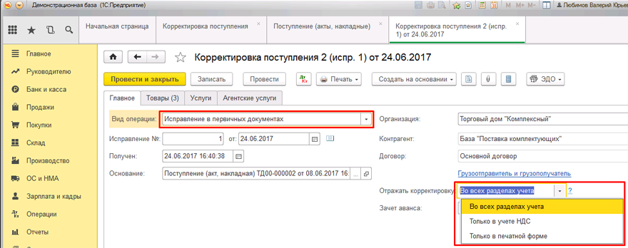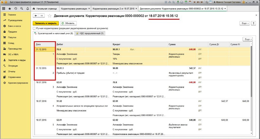 Корректировки поступлений и реализаций в 1С за прошлый период