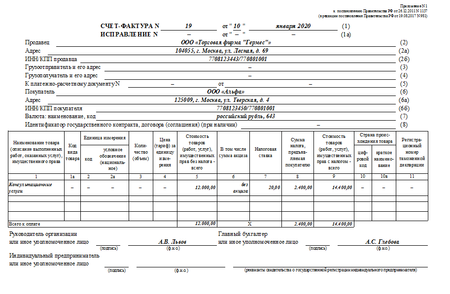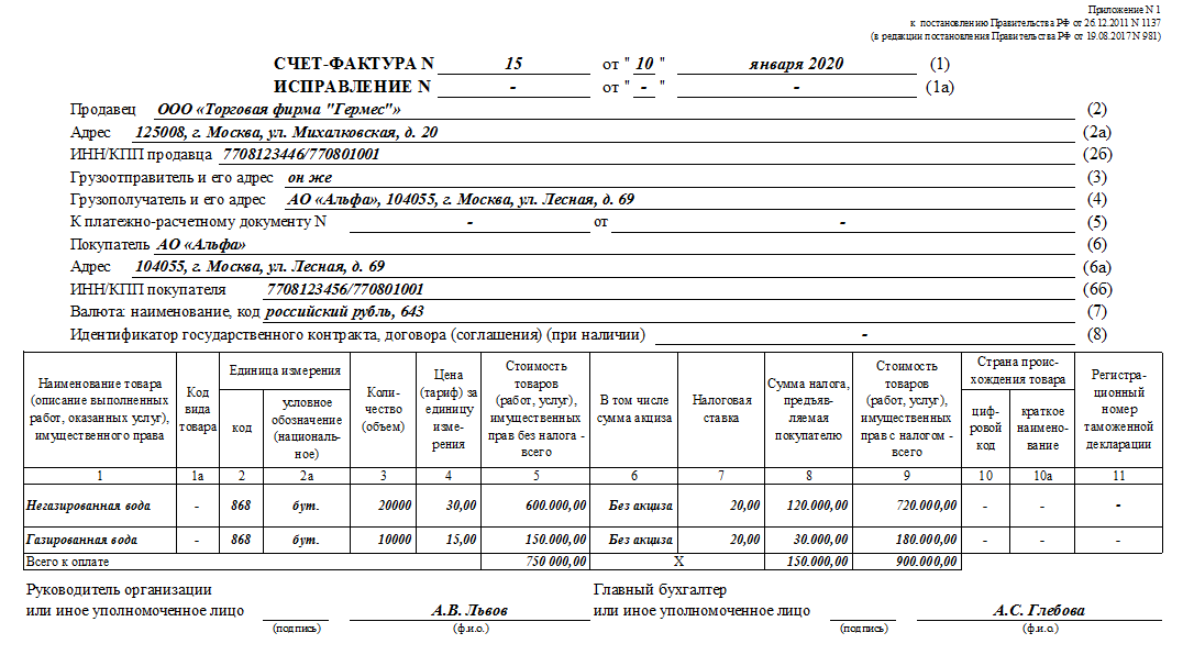 Вы можете скачать пример заполнения бланка счета-фактуры в 2020 году со ставкой НДС 20 процентов: