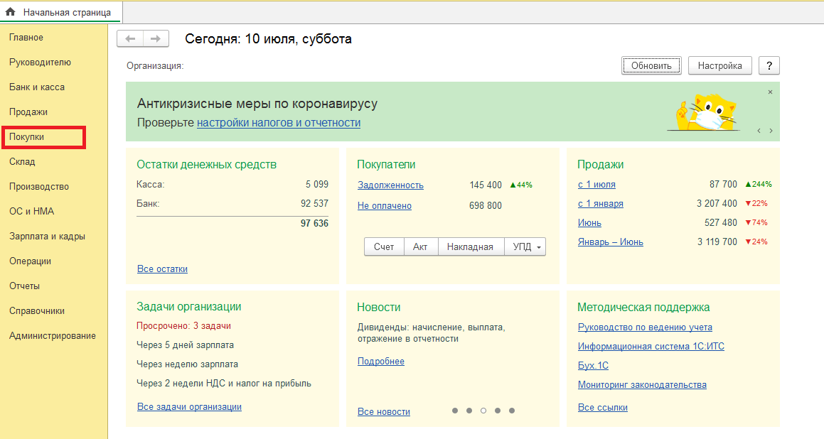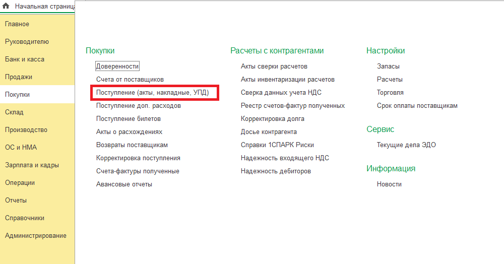 В разделе Покупки выбираем Поступление (акты, накладные, УПД).