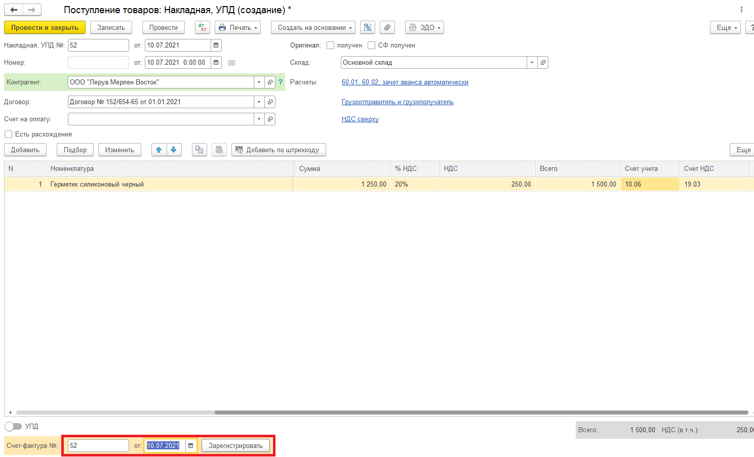 Далее вносим внизу номер и дату УПД или счета-фактуры и регистрируем его. Делать это надо в любом случае, даже если мы применяем УСН.