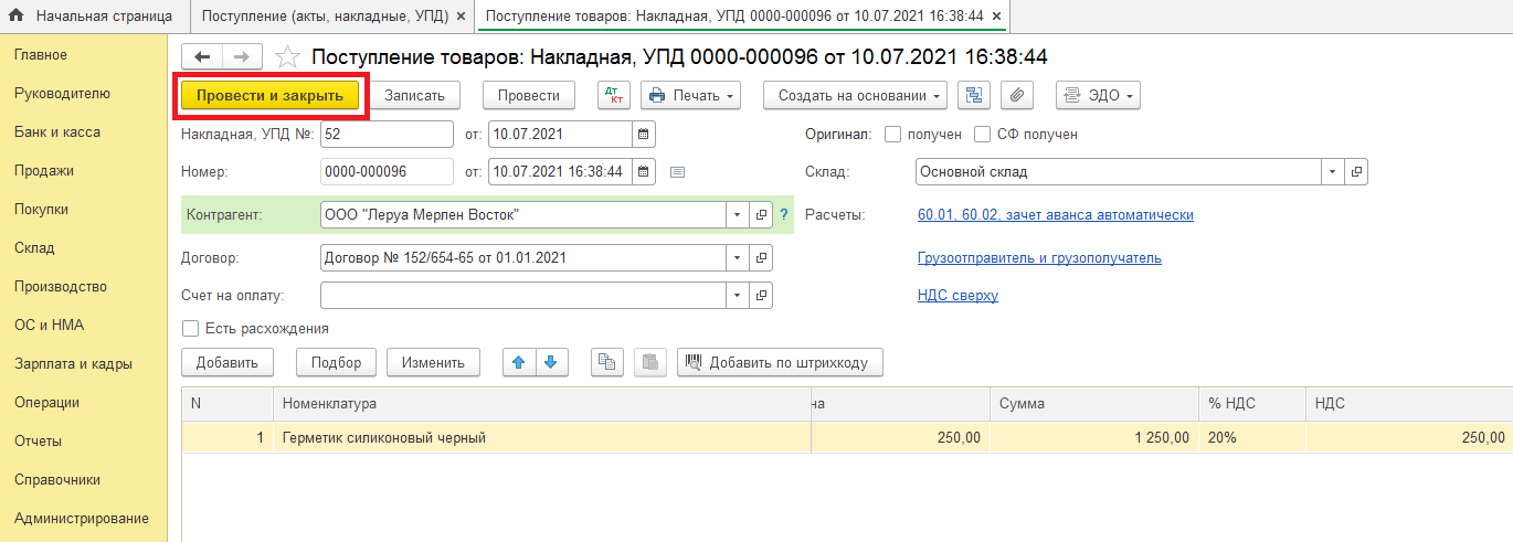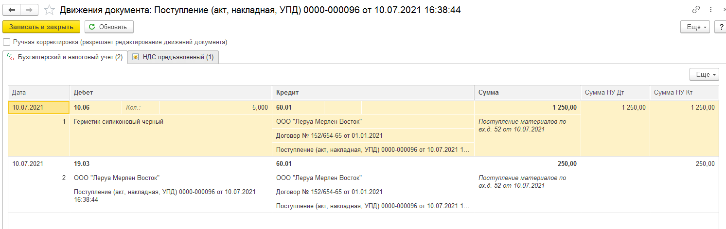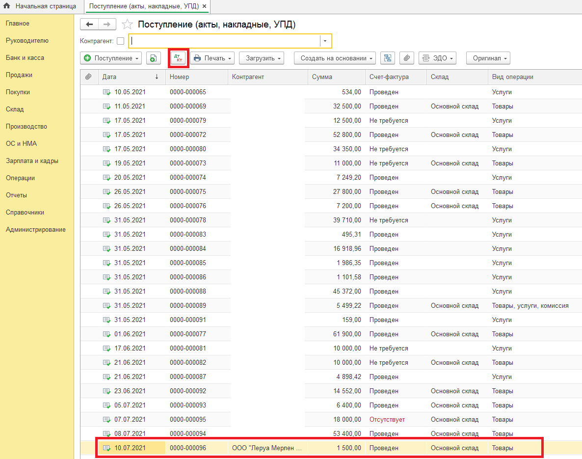 Поступление появилось в общем списке всех поступлений. Проверим кнопкой Дт/Кт, какие проводки сформировались данным документом.