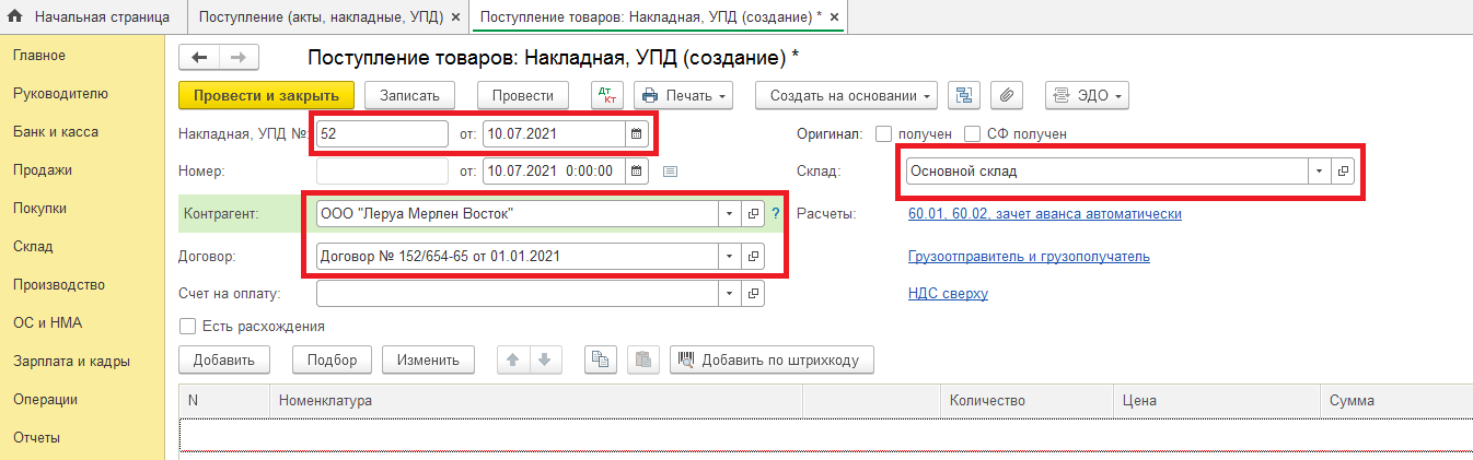 Появляется форма для внесения документа поступления материалов, где мы отражаем данные из накладной или УПД поставщика: номер и дату документа поставщика. Если такого контрагента у нас еще нет в базе, то необходимо будет его внести.