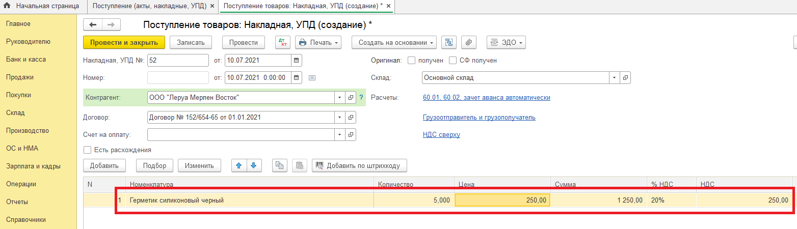 Если в документе от поставщика не один вид материалов, а несколько, то кнопкой Добавить аналогичным образом вносим все материалы, которые указаны в документе.