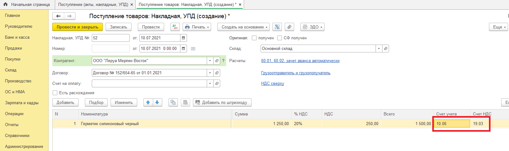 Счет, на который поступили МПЗ, выбираем в той же строке, где отражен наш материал, из выпадающего списка – плана счетов. Мы выбираем счет 10.06 (для товара был бы счет – 41.01). И так же выбираем счет учета НДС (при наличии).