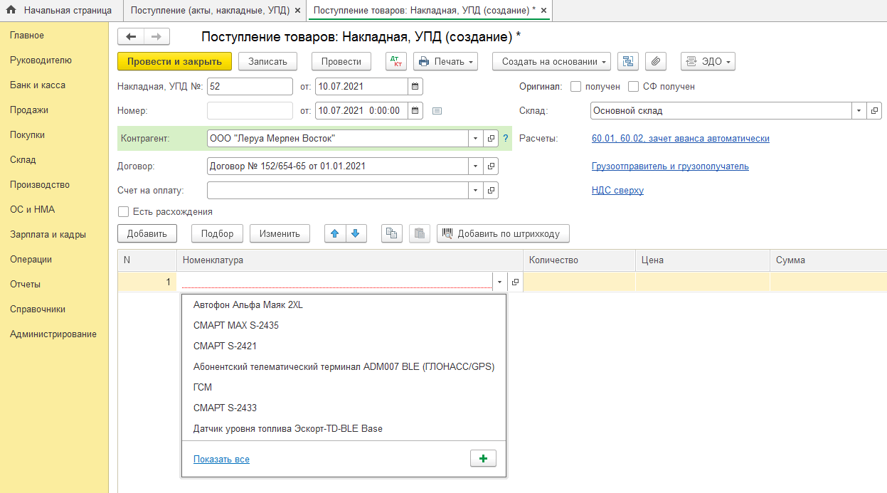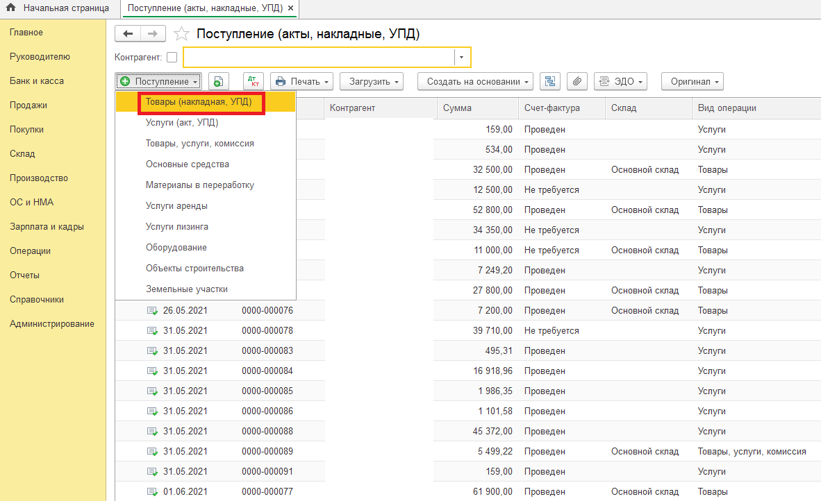 По кнопке Поступление выпадает список, где мы выбираем Товары (накладная, УПД).