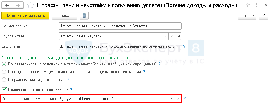 Аналитика по счету 91.01 задана разработчиками – подставляется та статья, для которой в поле Использование по умолчанию задан Документ «Начисление пеней».