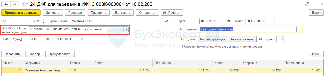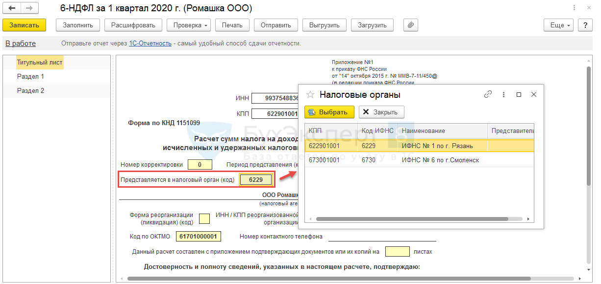 Также ИФНС можно выбрать вручную в самом отчете 6-НДФЛ на титульном листе. После выбора отчет необходимо перезаполнить, чтобы в него попали доходы и НДФЛ, проведенные в программе только по выбранной ИФНС.