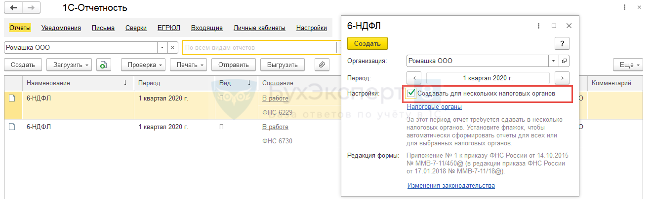 При создании нового отчета 6-НДФЛ в сервисе 1С-Отчетность можно установить флажок Создавать для нескольких налоговых органов. Тогда будут сразу созданы отчеты для всех ИФНС, по которым в этой организации ведется учет.