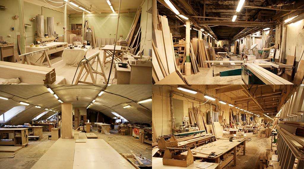 - Сложные, оборудованные специальными приспособлениями для мини-производства товаров, для мастер-классов. Это могут быть например столярное, оборудованные столярными, деревообрабатывающими приспособлениями и инструментами, или швейное производство, пространство которого будет наполнено швейными машинами, столами для раскроя ткани, лекалами, метровыми лентами и другими швейными принадлежностями.