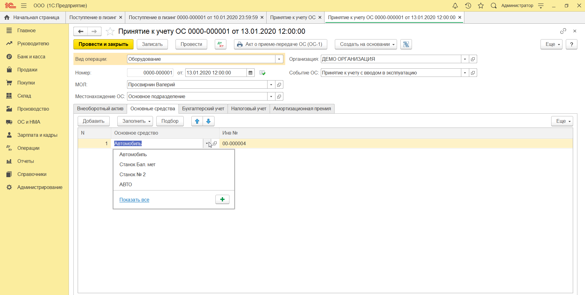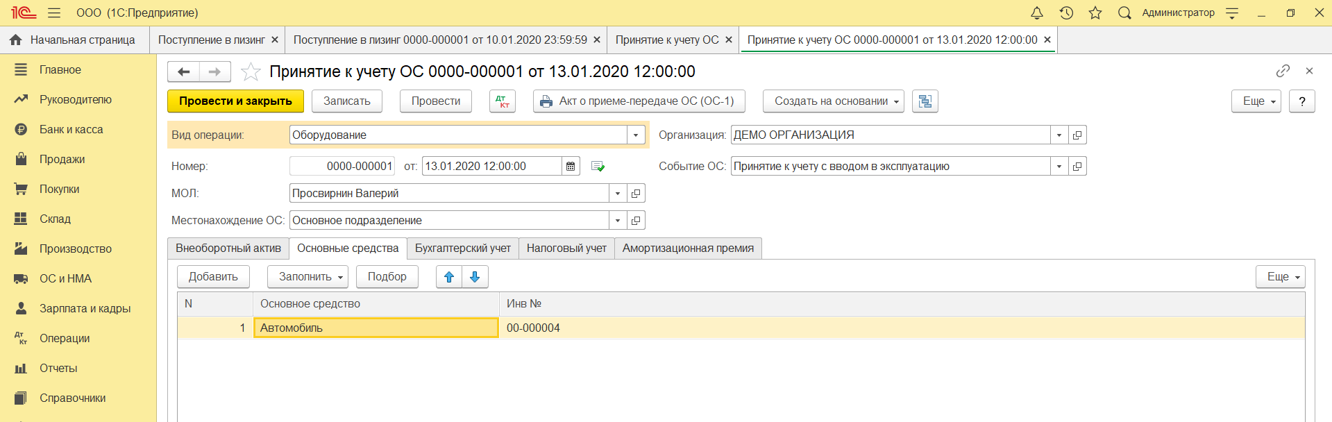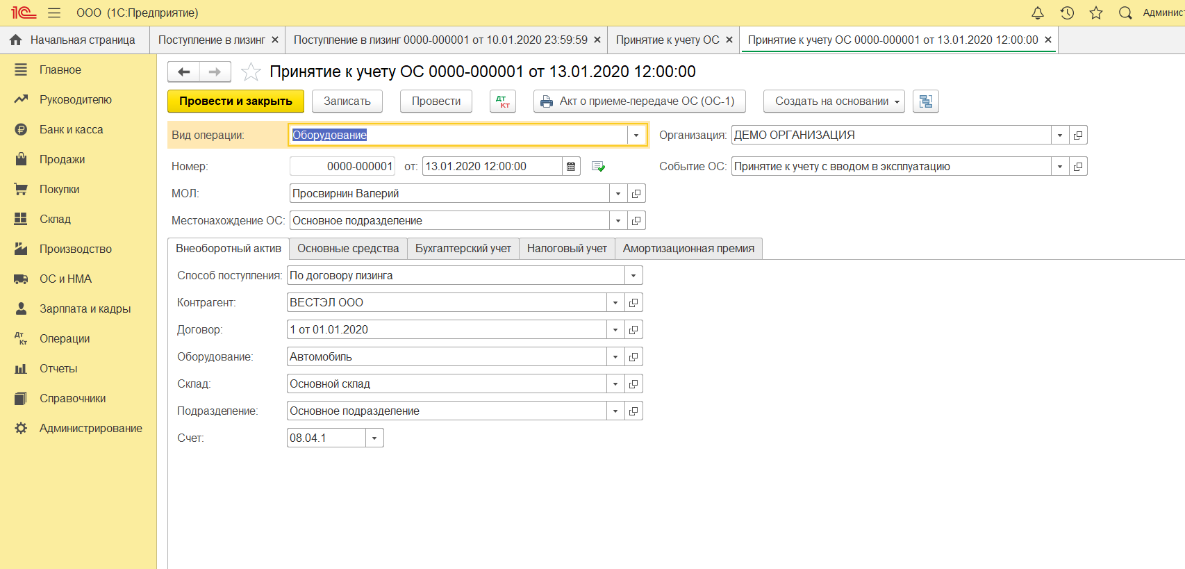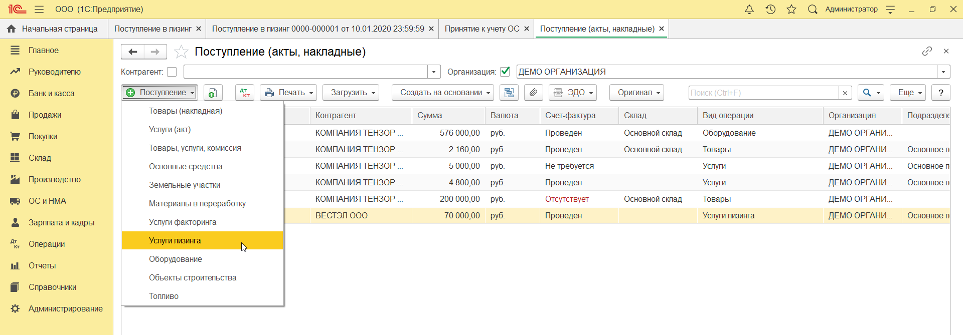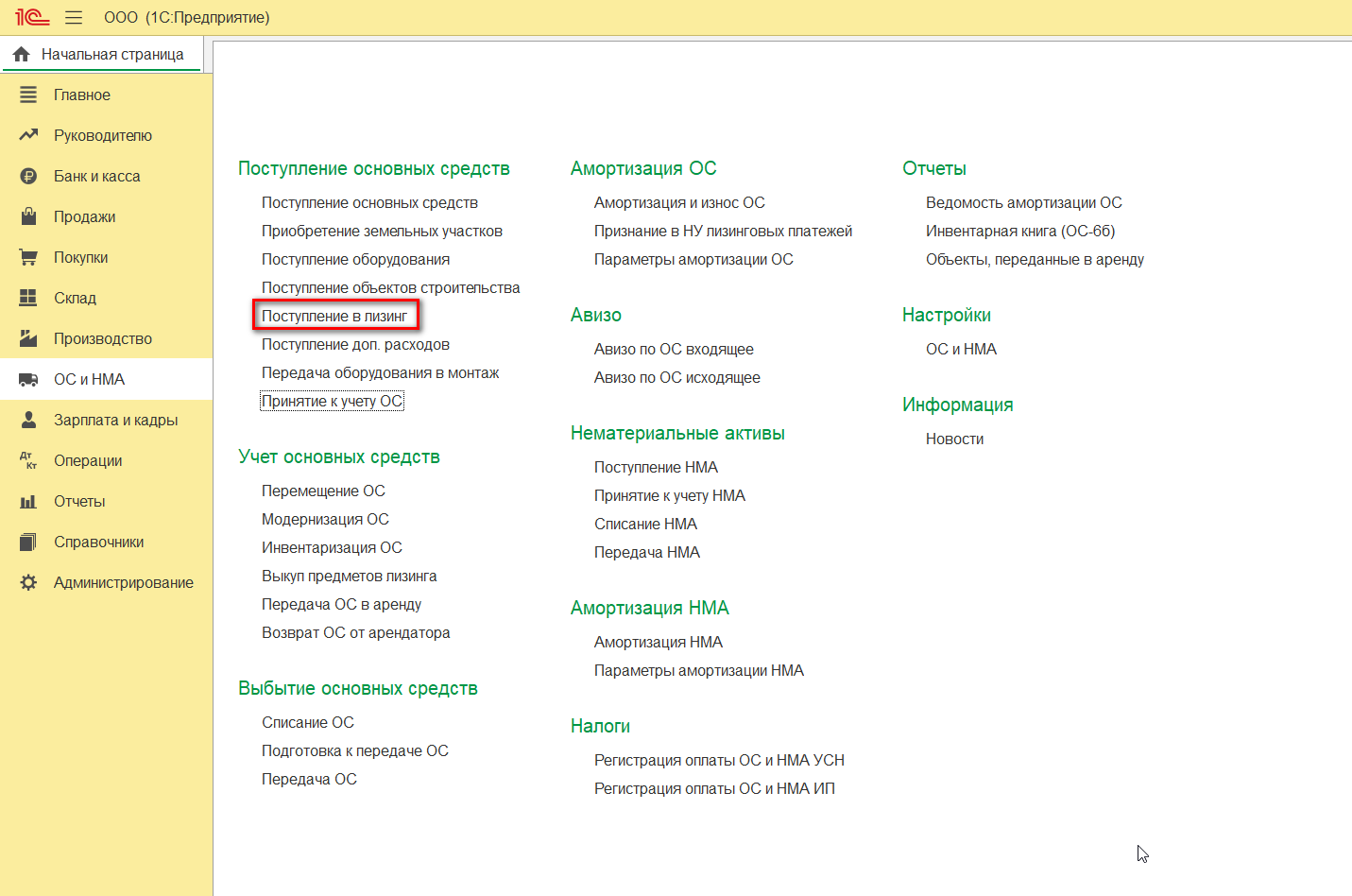 В программе 1С 8.3 можно выполнить учет лизинговых операций на балансе лизингополучателя. Для этого в «ОС и НМА-Поступление ОС» необходимо отыскать «Поступление в лизинг»