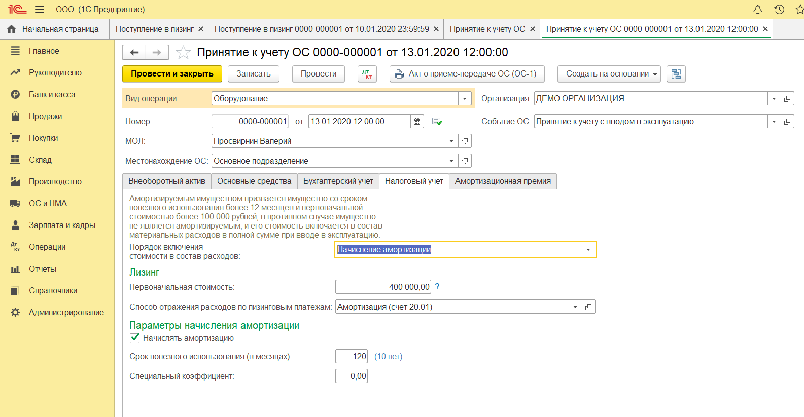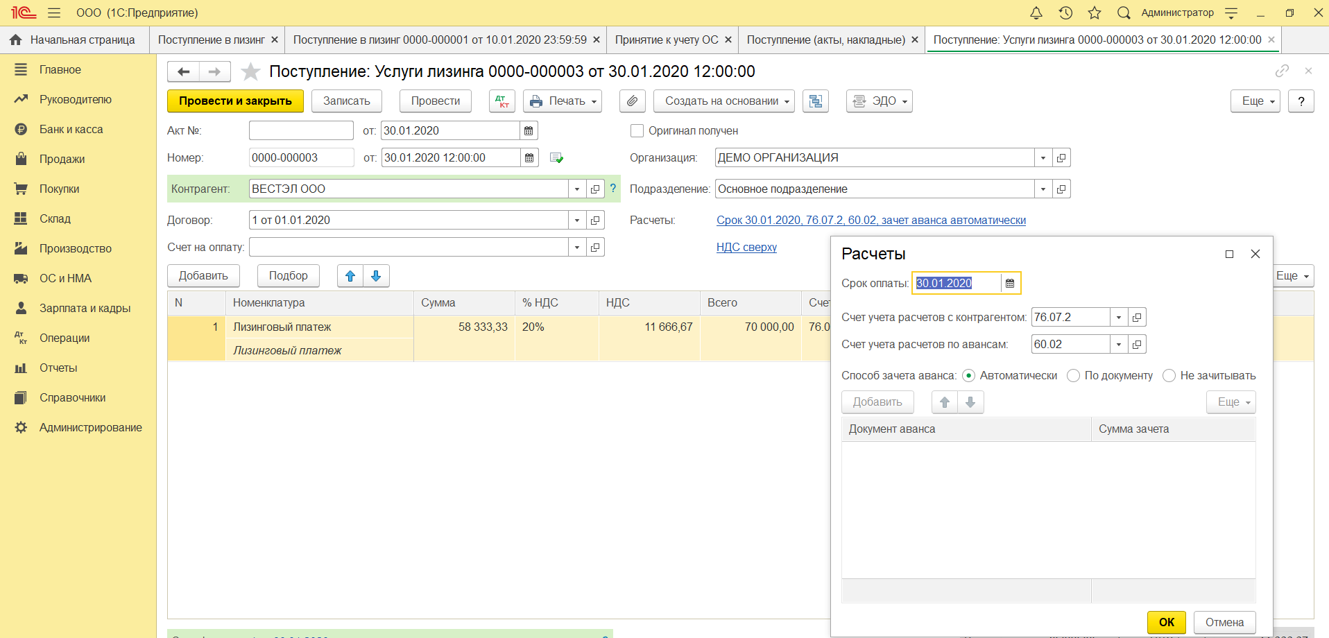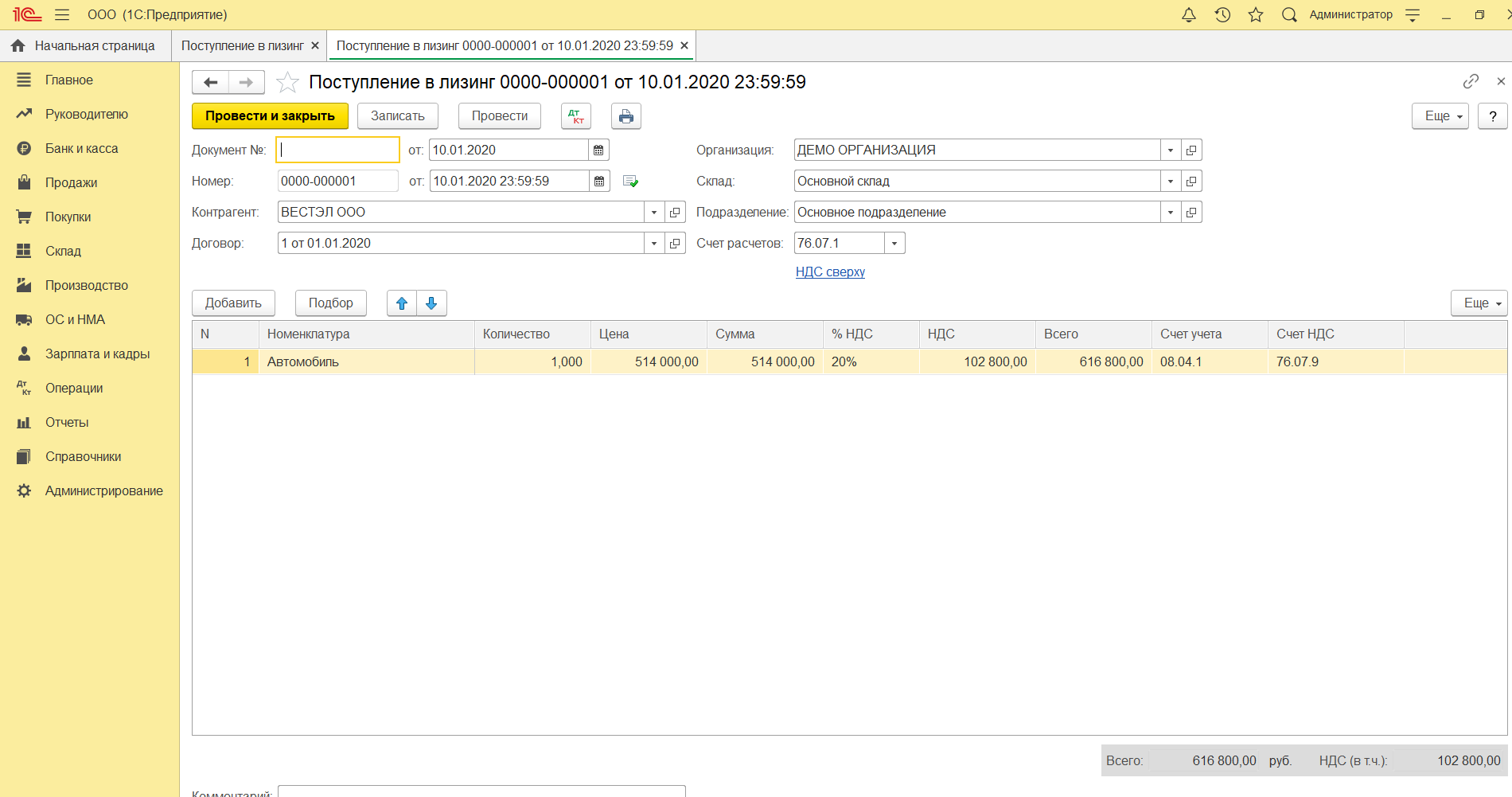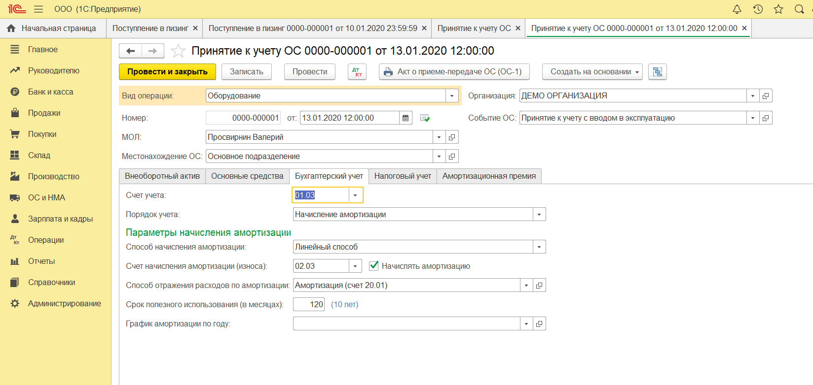 В программе 1С 8.3 можно выполнить учет лизинговых операций на балансе лизингополучателя. Для этого в «ОС и НМА-Поступление ОС» необходимо отыскать «Поступление в лизинг»