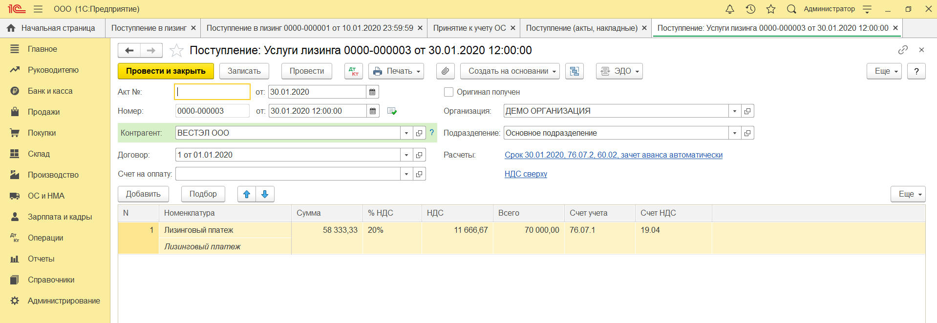В открывшемся акте для отражения лизинговых услуг укажите: