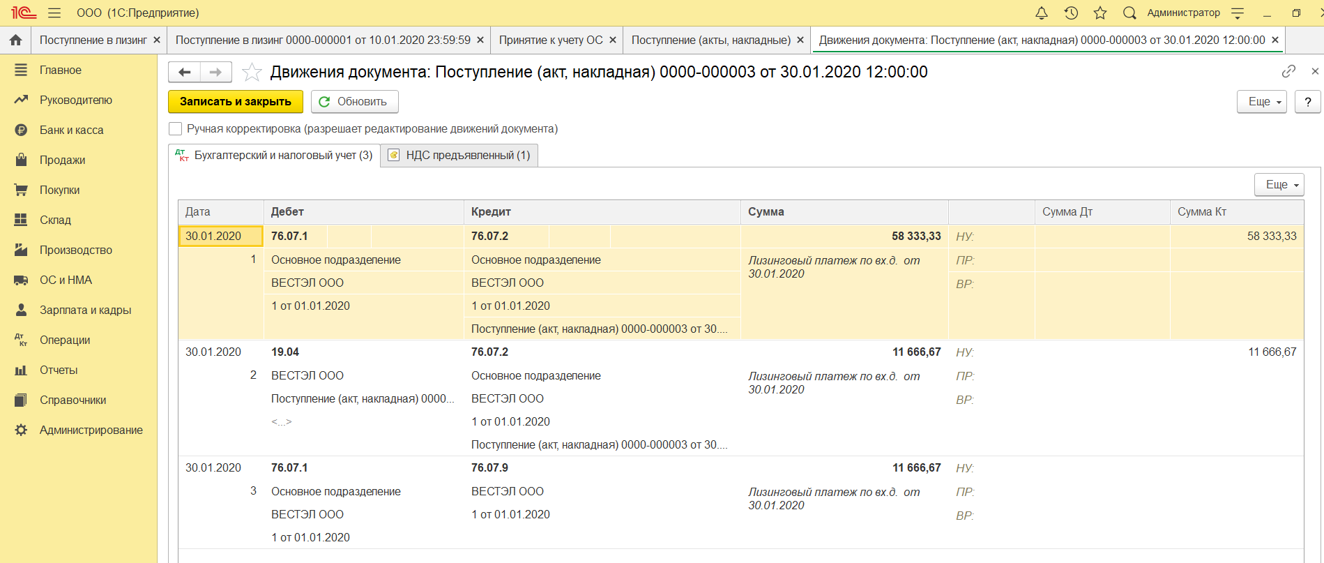Когда данные введены, нажмите «Провести». Теперь в бухучете и налоговом учете находятся записи по расходам на услуги лизинга. Чтобы посмотреть проводки по расходам, нажмите ДтКт и проверьте получившиеся проводки.