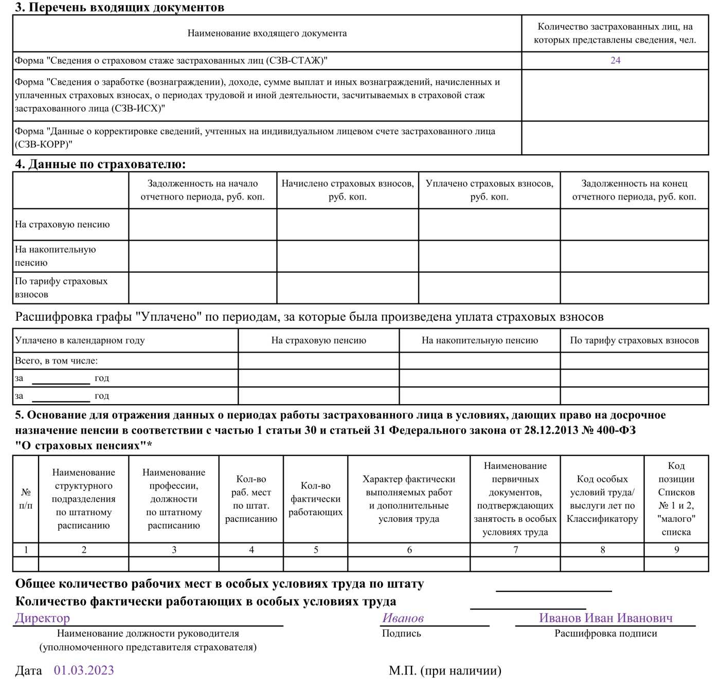 Эта часть в описи заполняется только в том случае, если она подается совместно с отчетами СЗВ-ИСХ или СЗВ-КОРР с типом «особая». В ней указываются сведения о начислении и уплате страховых взносов за отчетный период. Эти отчетные формы сдаются за периоды до 2020 года. В эти периоды страхователи передавали сведения об уплачиваемых взносах на обязательное пенсионное страхование непосредственно в ПФР. С 2020 года расчеты по страховым взносам передаются в ИФНС.
