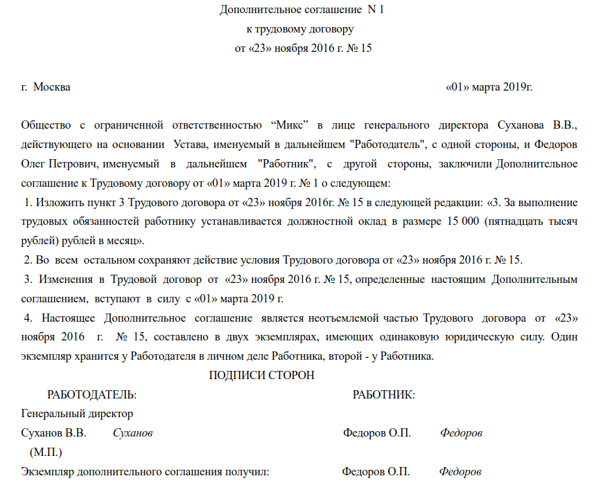Если же гражданин соглашается работать при условии уменьшения заработной платы, его согласие должно быть зафиксировано. Для этого будет составлен образец допсоглашения об изменении оклада.