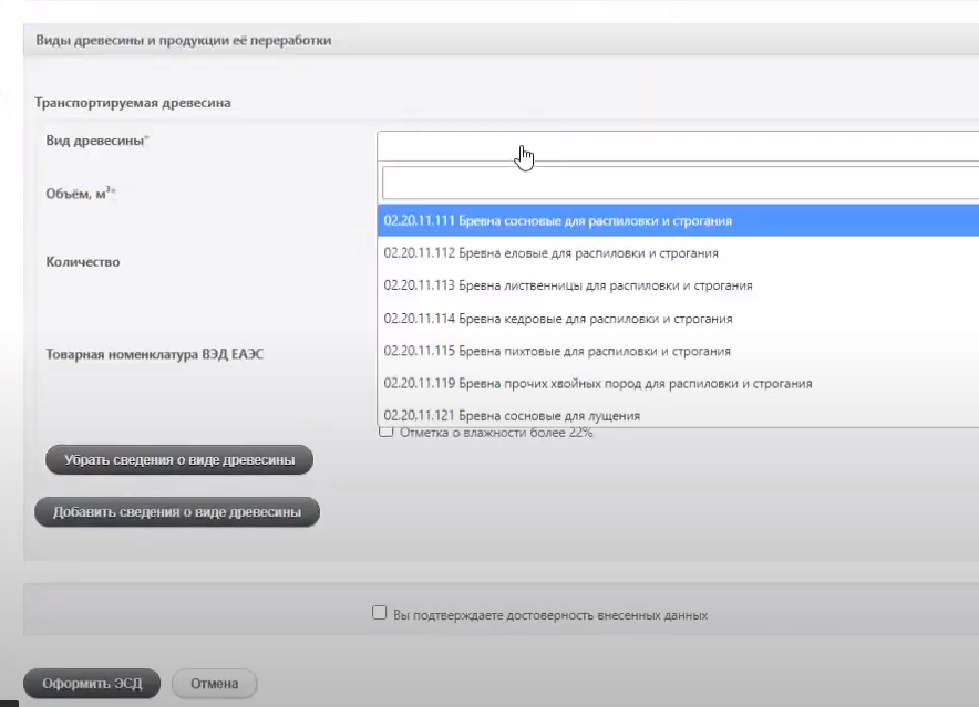 Далее заполняем аналогичные поля для остальных видов древесины, которые перевозятся по данному ЭСД.
