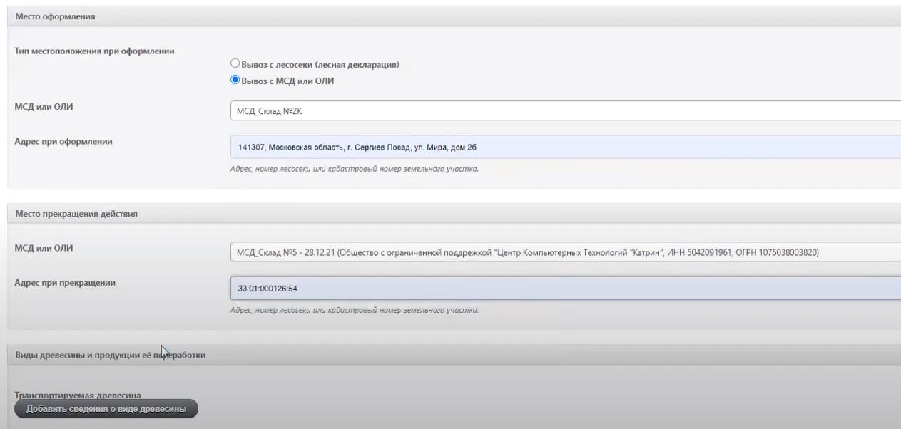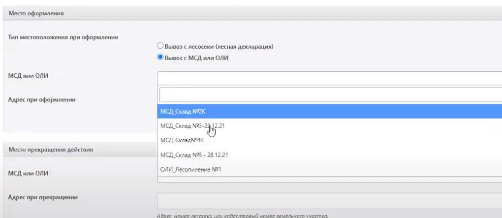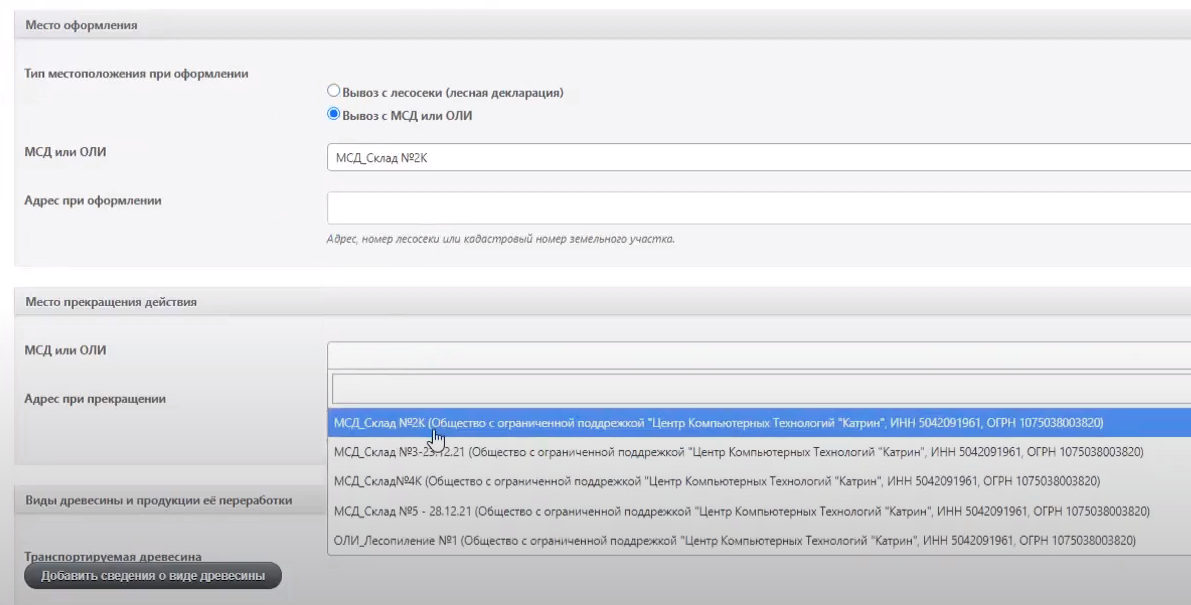 Аналогично выбираем МСД или ОЛИ, куда доставляется древесина: