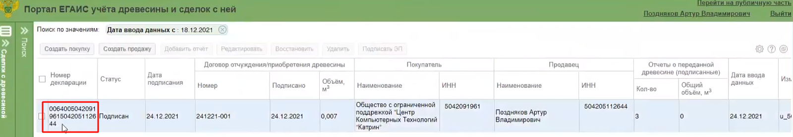 Если отгрузка производится по факту сделки, то мы можем взять номер декларации о сделке из поля в ЕГАИС Лес: