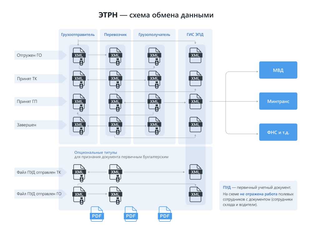 Участники обмена оформляют и передают электронную транспортную накладную через операторов ЭДО в ГИС ЭПД — государственную информационную систему электронных перевозочных документов. ГИС ЭПД обеспечивает получение, обработку и хранение электронных перевозочных документов. ФНС, ГИБДД и другие контролирующие органы могут обращаться к ГИС ЭПД за данными о грузоперевозках.