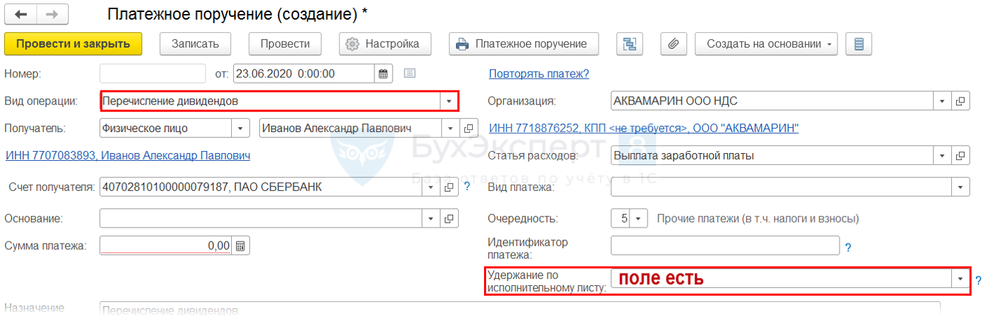 Платежка Перечисление дивидендов. Нет поля Удержание по исполнительному листу: