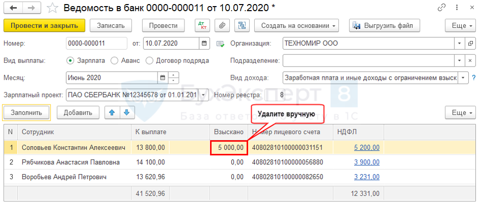 - Графа Взыскано в Ведомости в банк при выплате зарплаты