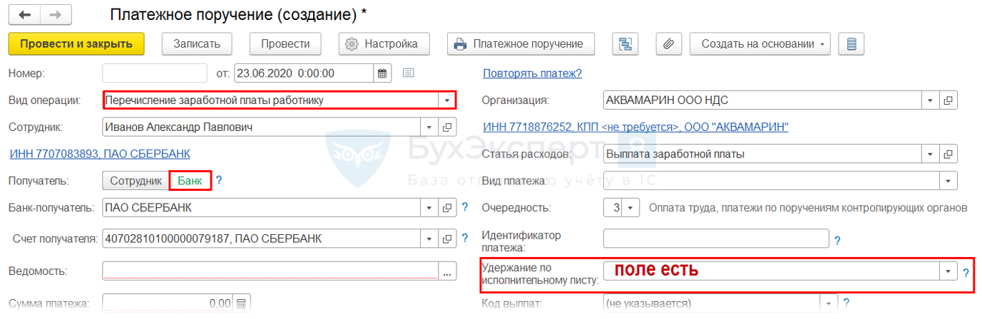 Платежка Перечисление ЗП работнику, Получатель банк. Нет поля Удержание по исполнительному листу: