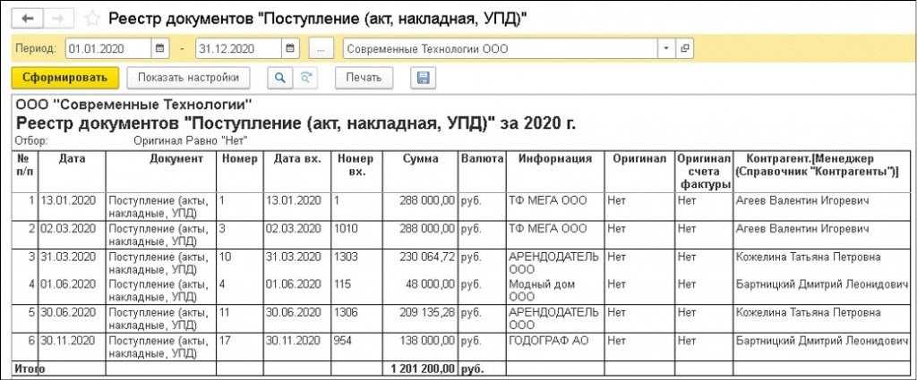 Когда пользователь привяжет к каждому контрагенту конкретного ответственного сотрудника, можно создавать отчеты по проблемной первичной документации. К примеру, этот момент относится к документам, по которым не поступили оригиналы или которые оформлены с нарушением требований законодательства. В сформированном отчете будут указываться сотрудники, которые несут ответственность за работу с конкретным контрагентом.