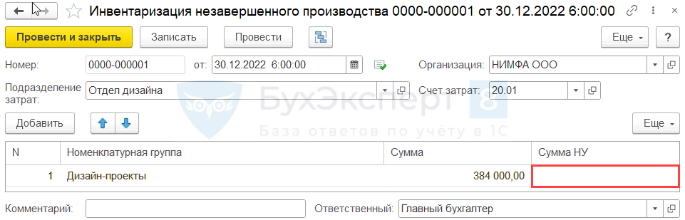 20.01 | — | 384 000 | Отражение НЗП в БУ | Инвентаризация незавершенного производства | ||