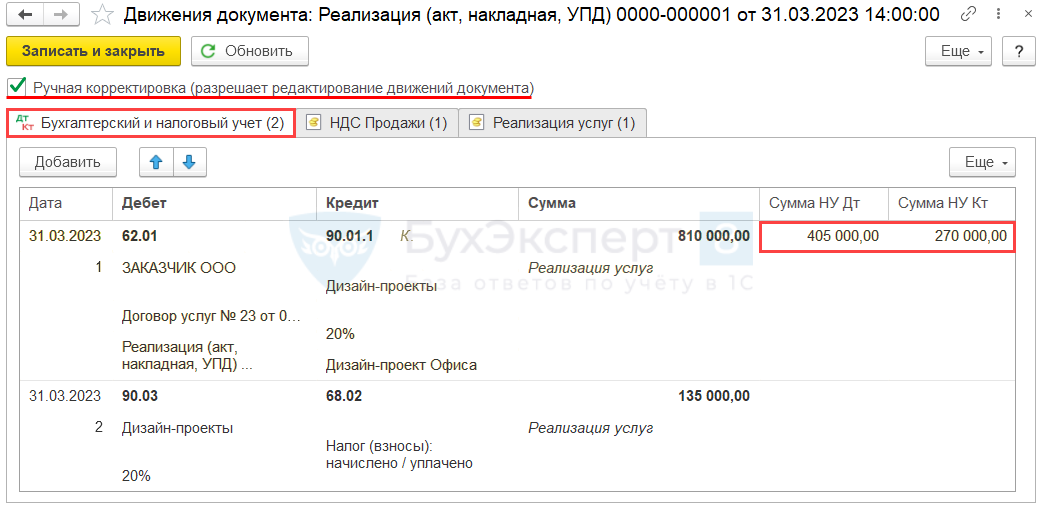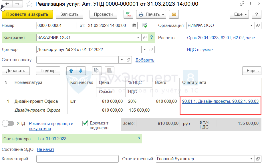 | 31 марта | 62.01 | 90.01.1 | 810 000 | 405 000 | 270 000 | Выручка от реализации работ | Реализация (акт, накладная) — Услуги (акт) |