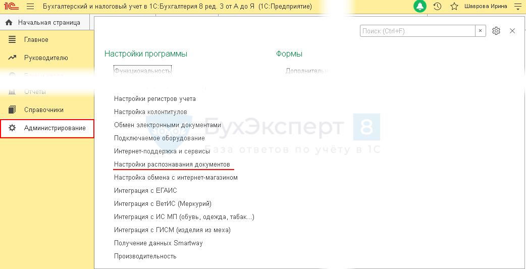 - В разделе Администрирование ищем пункт по настройке распознавания документации;