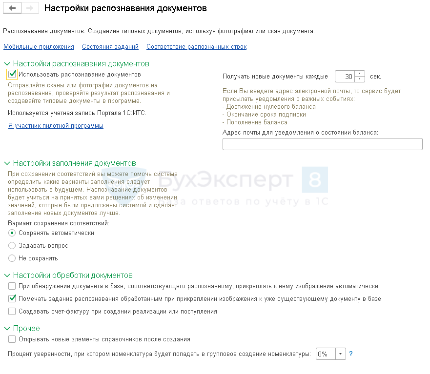 - флажок Использовать распознавание документов — отвечает за возможность распознавать сканы или фотографии документов и загружать их в 1С с использование учетной записи Портала 1С:ИТС;