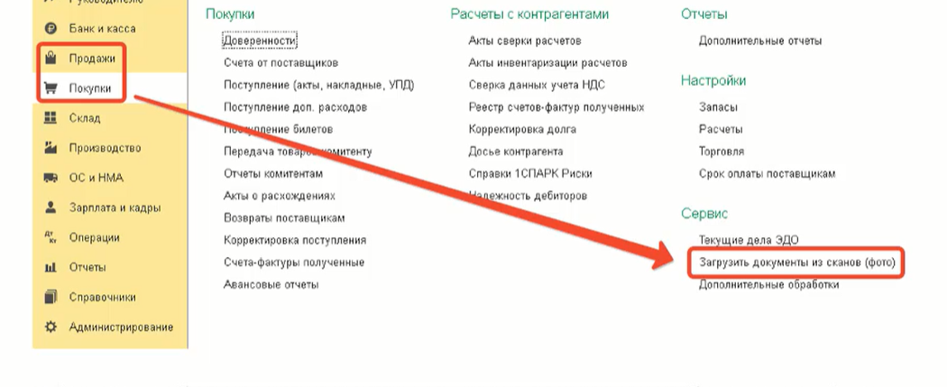 Например, в Бухгалтерии предприятия для этого в разделах главного меню «Продажи» или «Покупки» выберите пункт «Загрузить документы из сканов (фото)»