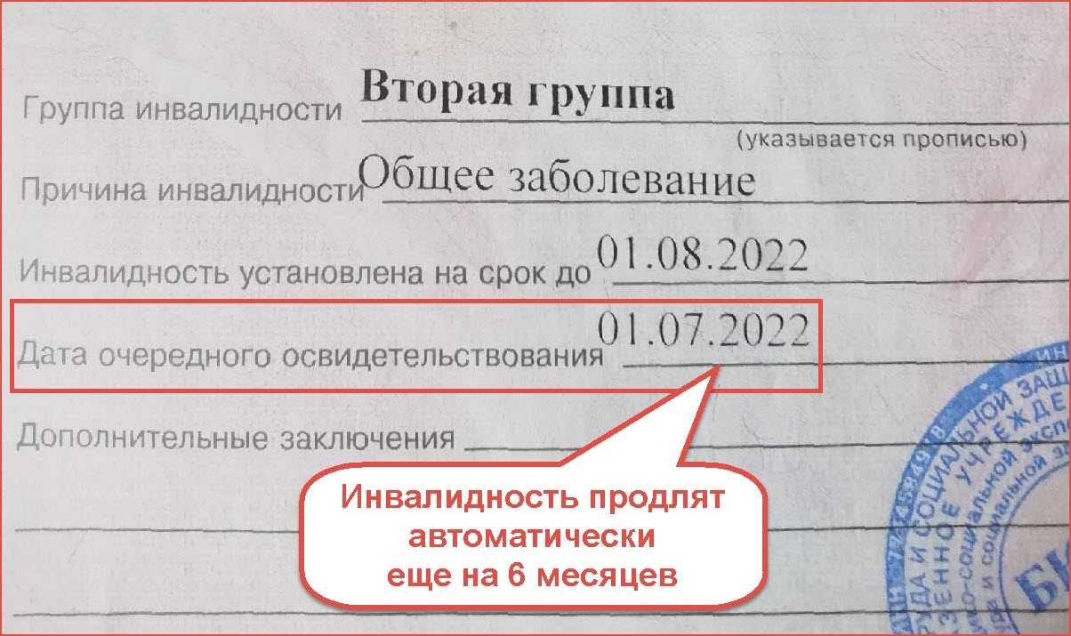 Если же дата очередного освидетельствования 02.07.2022 или позже, тогда автопродления не будет, и в данном случае необходимо обратиться в медицинскую организацию для оформления направления на МСЭ.