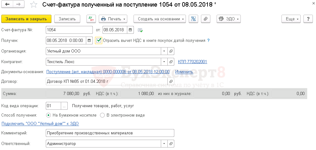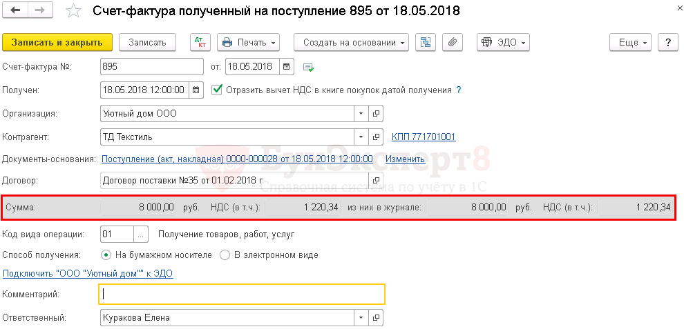 Рассмотрим заполнение полей документа Счет-фактура на поступление.