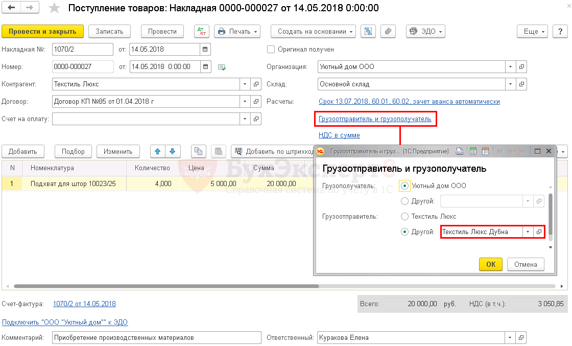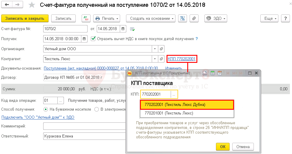 Бухгалтер в 1С должен указать тот КПП, который проставлен в счете-фактуре поставщика.